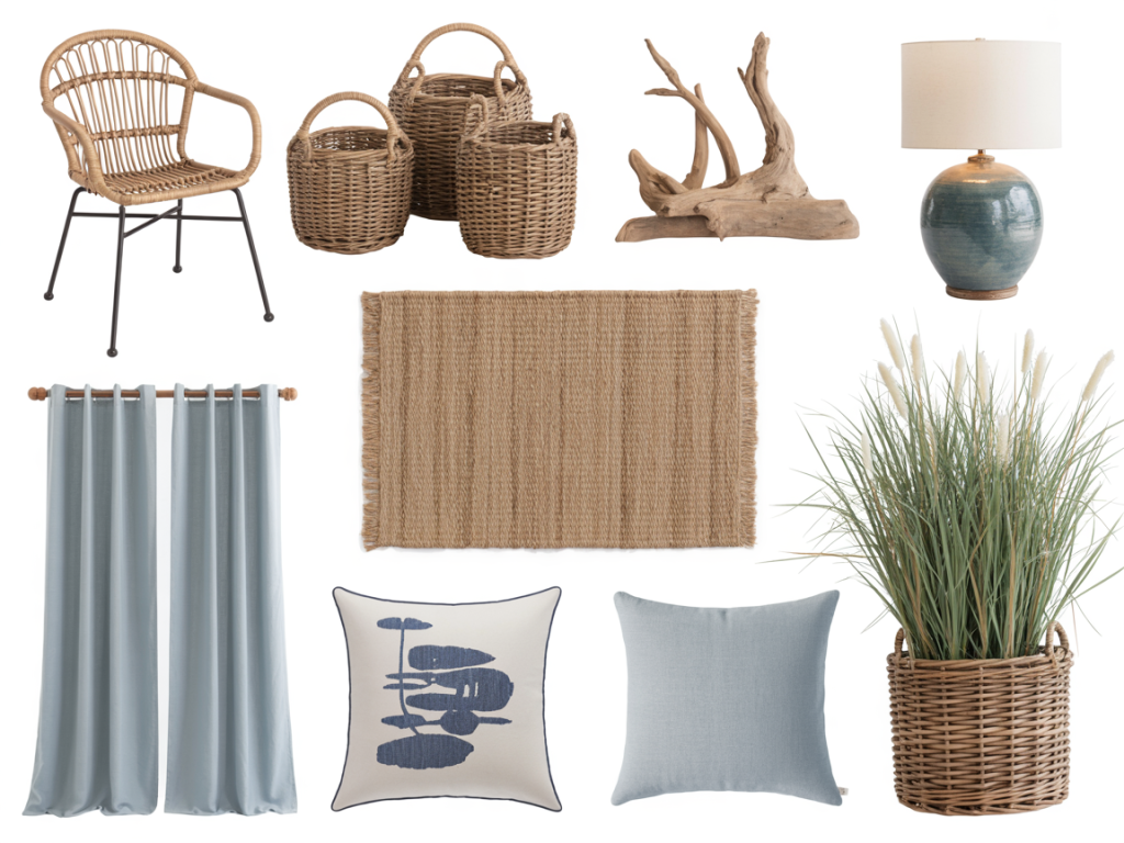 Incorporate sandy neutrals, soft aqua accents, and natural materials such as jute, seagrass, and linen. Avoid over-themed décor—keep it elevated and subtle.
