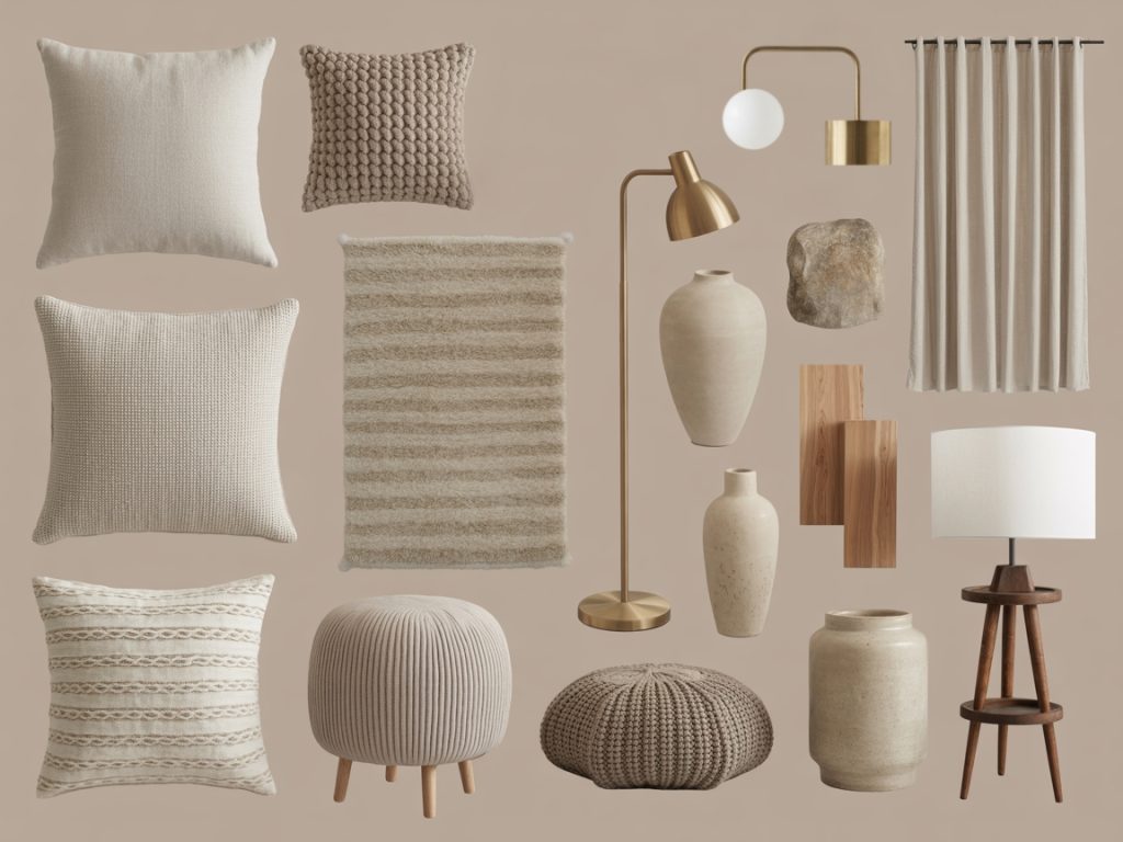 - Cream & Taupe Throw Pillows – Mix subtle patterns and textures for depth.