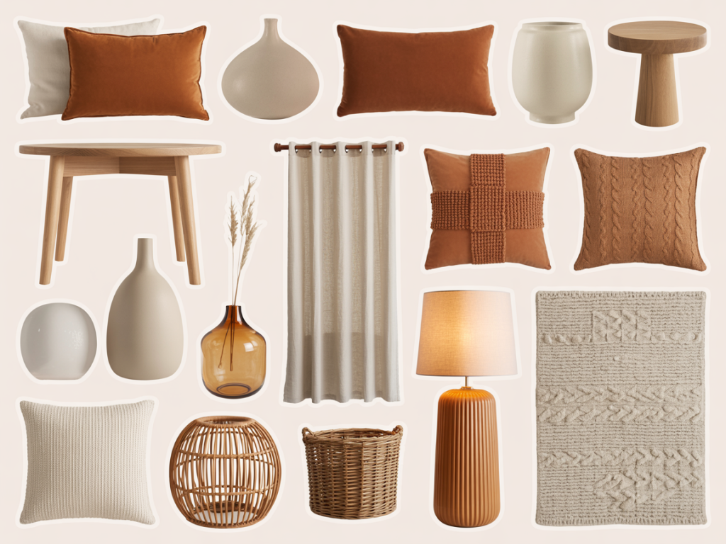 - Warm Neutral Sofa – Sets a soft, inviting base that anchors the warm tone palette.